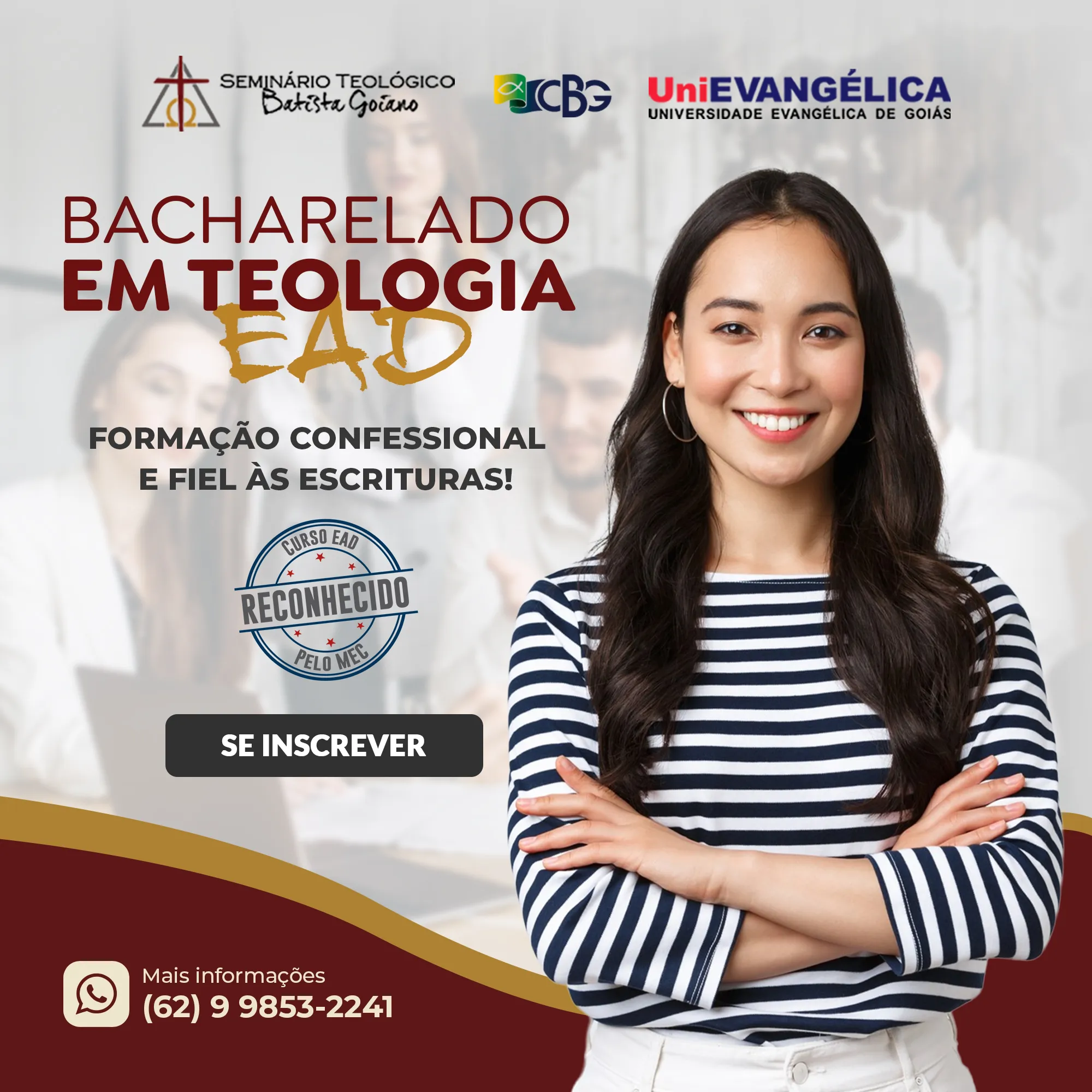A parceria entre a UniEVANGÉLICA, Seminário Batista Goiano e a Convenção Batista Goiana trouxe o Bacharelado em Teologia EAD, feito para aqueles que creem em Jesus Cristo, que amam a Palavra de Deus e desejam crescer no conhecimento das Escrituras. Seja você um líder ministerial, alguém que deseja se aprofundar na fé cristã ou um crente comprometido que quer conhecer melhor a Bíblia Sagrada, aqui você encontrará uma formação confessional, fiel às Escrituras e comprometida com a igreja e a missão de Deus no mundo.